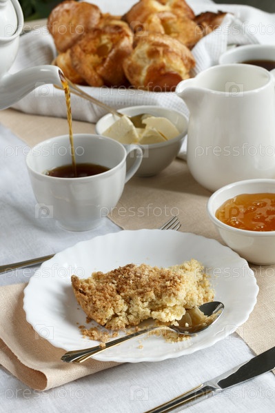 Домашний семейный завтрак с чаем с молоком, медом и выпечкой