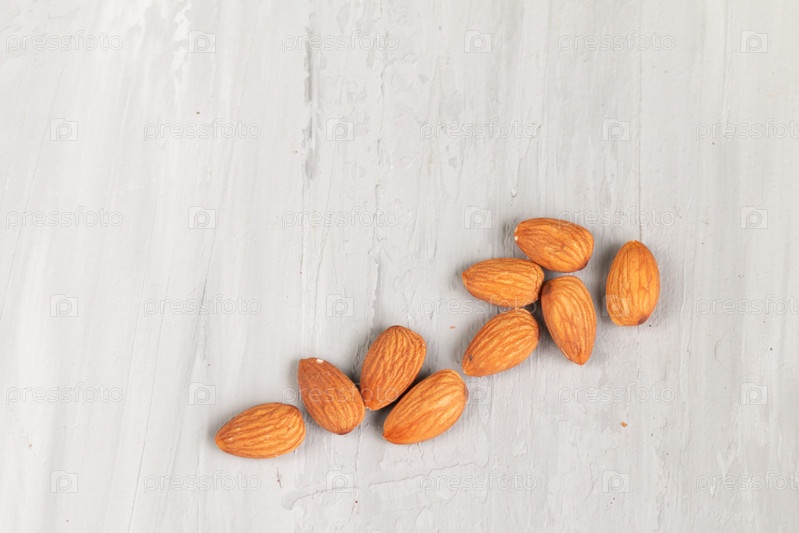 Текстура семян миндаля, вид сверху на сером бетонном фоне, пустое место для текста, концепция органического здорового питания