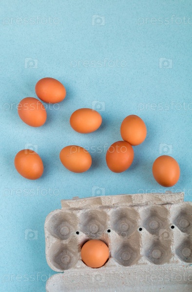 Группа коричневых куриных яиц на светло-голубом фоне, пустое место для текста