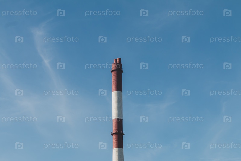 Красный и белый дымоход на фоне голубого неба. концепция загрязнения окружающей среды