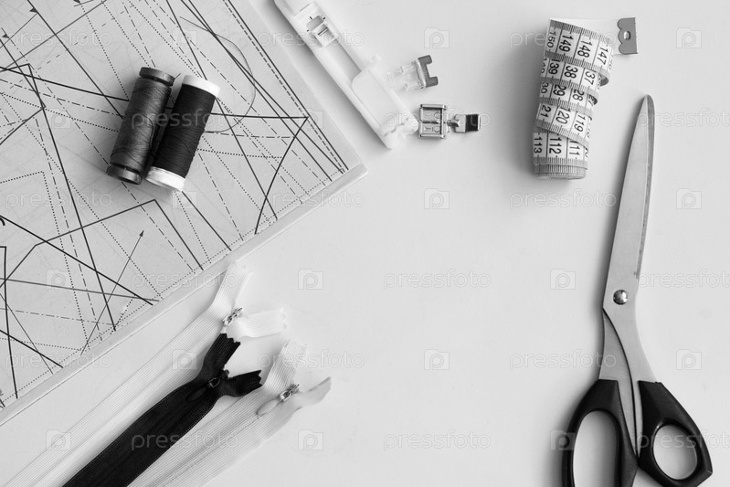 Швейные инструменты с бумажным рисунком, концептуальное изображение дизайнерской работы, черно-белый режим с пустым местом для текста