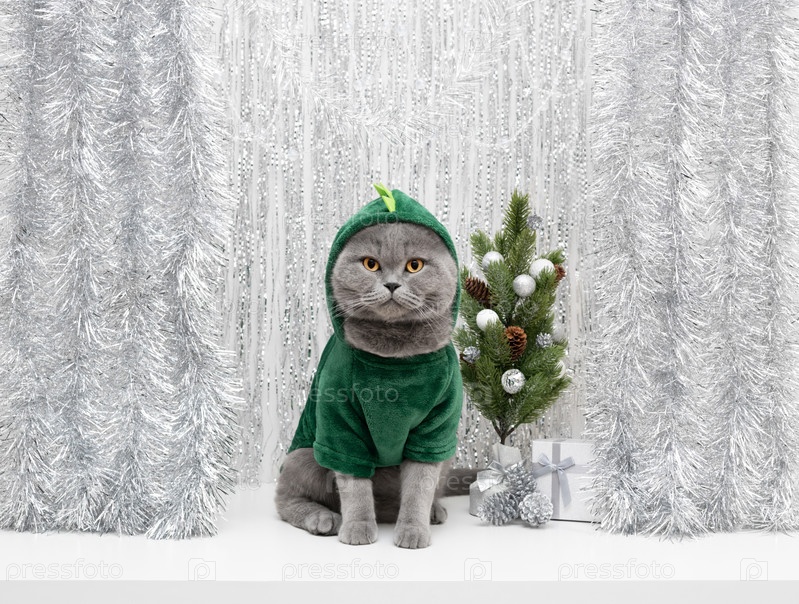 Британский кот в костюме дракона с елкой и подарком на серебряном фоне. Забавный кот в одежде с праздничными украшениями. Символ китайского Нового 2024 года. Копирование пространства