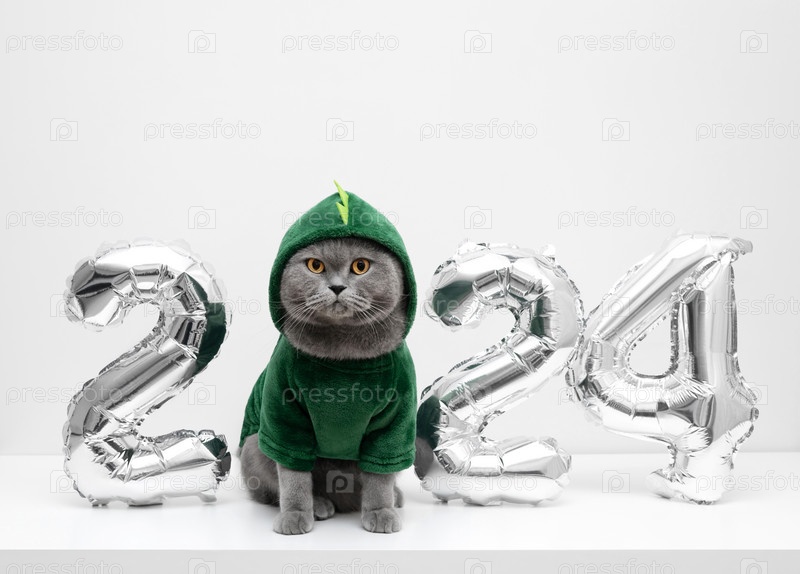 Рождественский кот в костюме дракона с номерами серебряных воздушных шаров на белом фоне с копировальным пространством. Британский кот в зеленой толстовке. Символ 2024 нового года