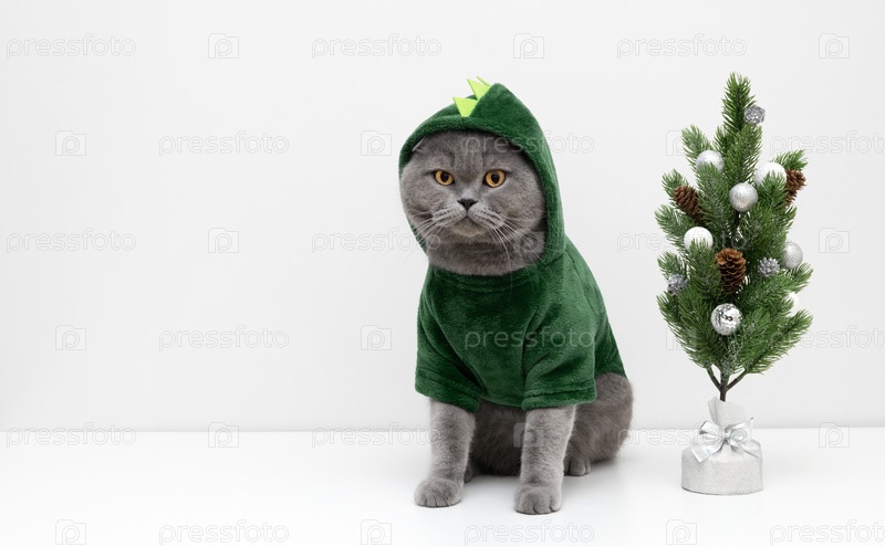Кот в костюме зеленого дракона с рождественской елкой на белом фоне с копировальным пространством. Британский кот в толстовке. Символ 2024 года