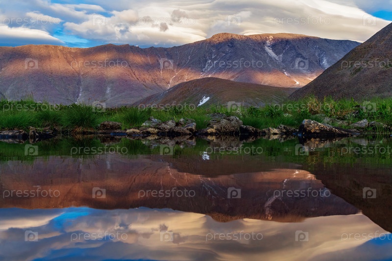 Пейзаж горного озера на закате летним вечером