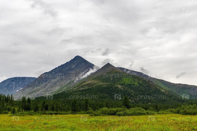 Горная вершина над лесом в дождливый летний день