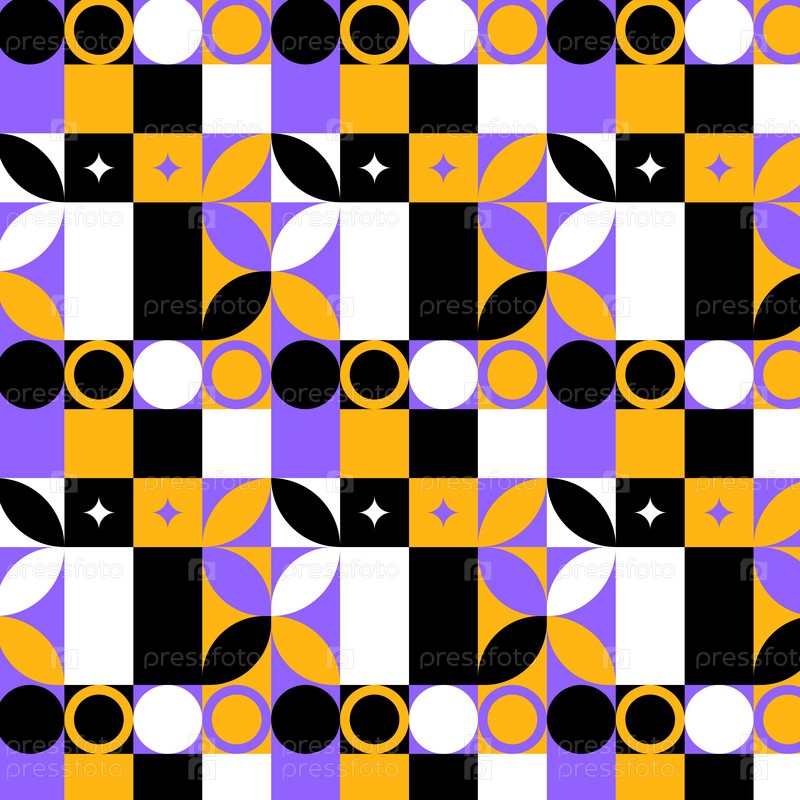 Геометрический современный бесшовный узор с лепестками, кругами, кольцами, звездами, бриллиантами, желтый, черный, фиолетовый, белый, векторное изображение