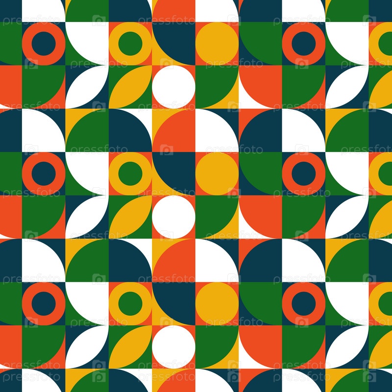 Геометрический простой узор, бесшовный с частями, круги, зерна, квадраты, белый, зеленый, синий, желтый, оранжевый, векторное изображение