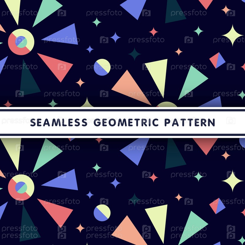 Геометрический современный узор бесшовные с хаотичными абстрактными солнцами, цветами, звездами, шарами, желтым, фиолетовым, коралловым, персиковым, лимонным, векторное изображение