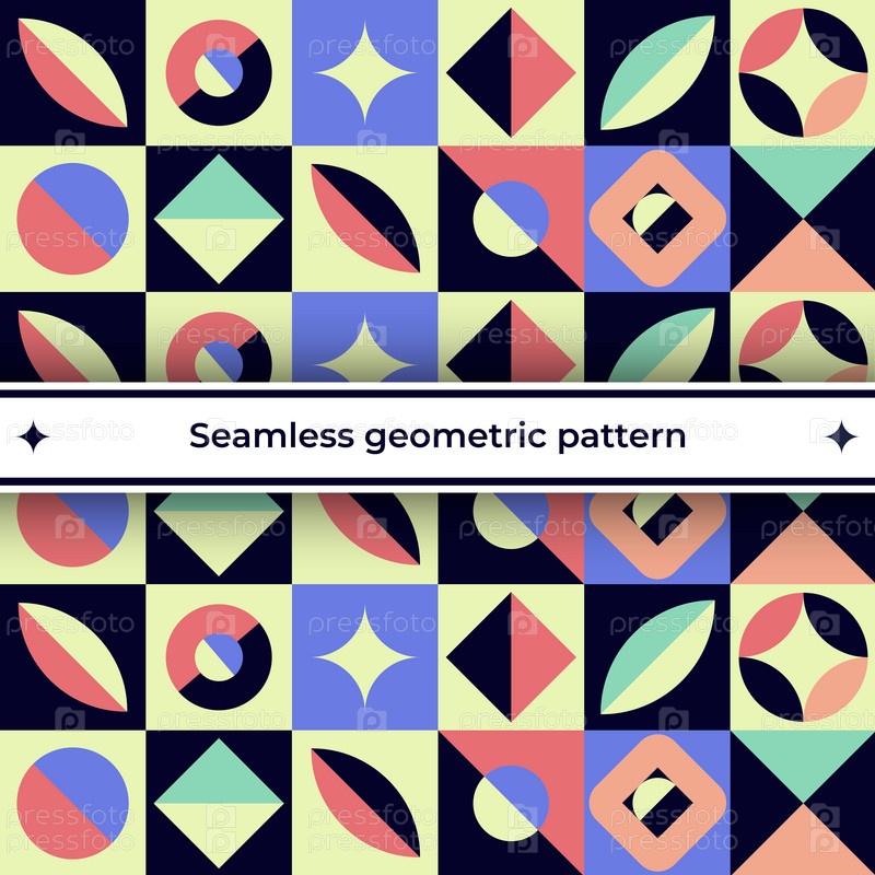 Геометрический современный детский узор бесшовный с различными квадратами, сложными шариками, желтый, фиолетовый, коралловый, персиковый, лимонный, векторное изображение