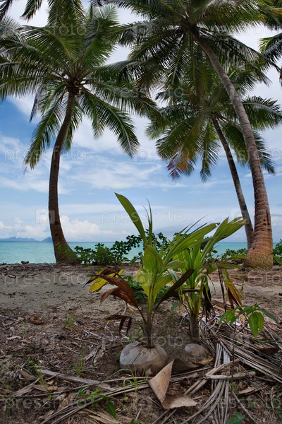 Восточная Малайзия, остров Сибуян. Проросший кокосовый орех на песчаном берегу Тихого океана
