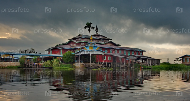Ивама. Мьянма. 29 ноября 2016 г. Архитектура поселений на реке Сав между озерами Инле и Самкар. Из-за подтопления почти все дома на реках и озерах построены в воде на сваях