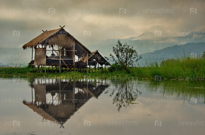 Ивама. Мьянма. 29 ноября 2016 г. Архитектура поселений на реке Сав между озерами Инле и Самкар. Из-за подтопления почти все дома на реках и озерах построены в воде на сваях