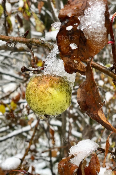 Ледяное яблоко висит на ветке дерева в саду после первого снегопада