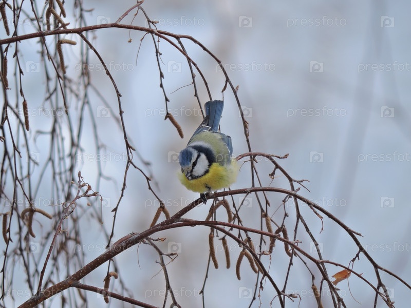 Синица лазоревка зимой сидит на ветке