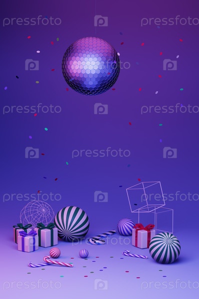 Новогоднее оформление вечеринки с диско-шаром, 3d рендеринг