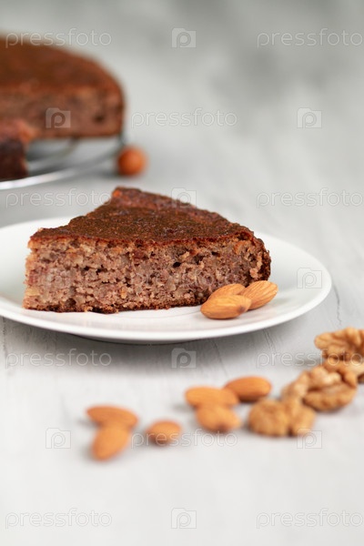 Домашний полезный пирог из орехов и фиников, без муки. Органические продукты питания, пустое место для текста