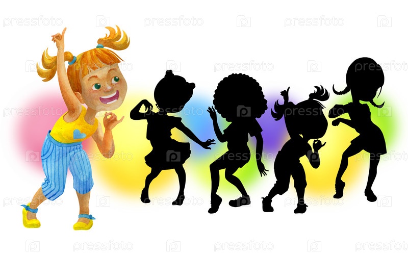 Веснушчатая девочка школьного возраста весело танцует. Игра Найди тень. Акварельная иллюстрация