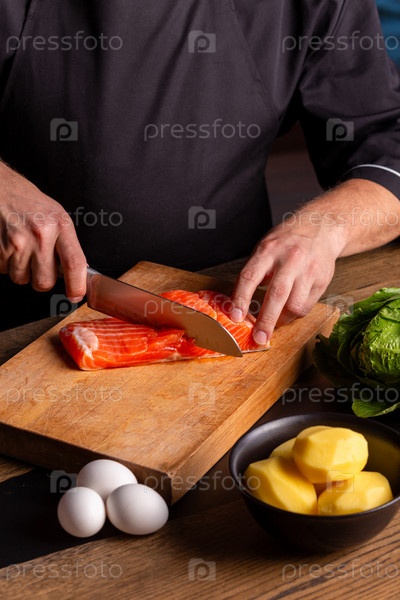 Крупным планом одетый в черное шеф-повар режет ножом лосося на профессиональной кухне. За кулисами приготовления ужина в ресторане. Концепция питания