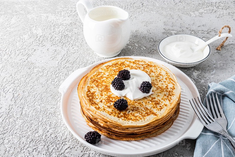 Большая стопка вкусных горячих блинов со сметаной и ежевикой на красивом белом подносе. Традиционное угощение фестиваля