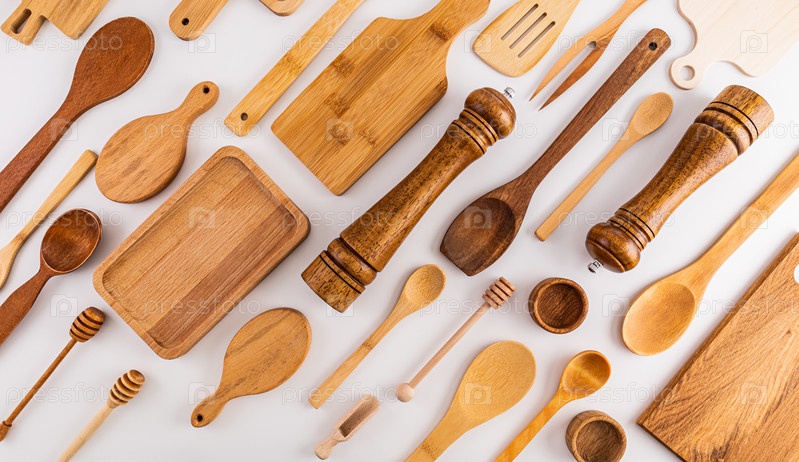 Кухонная деревянная посуда, кухонные принадлежности на белом фоне. Плоская параллельная диагональная планировка. Кухонный фон. крышка. макет