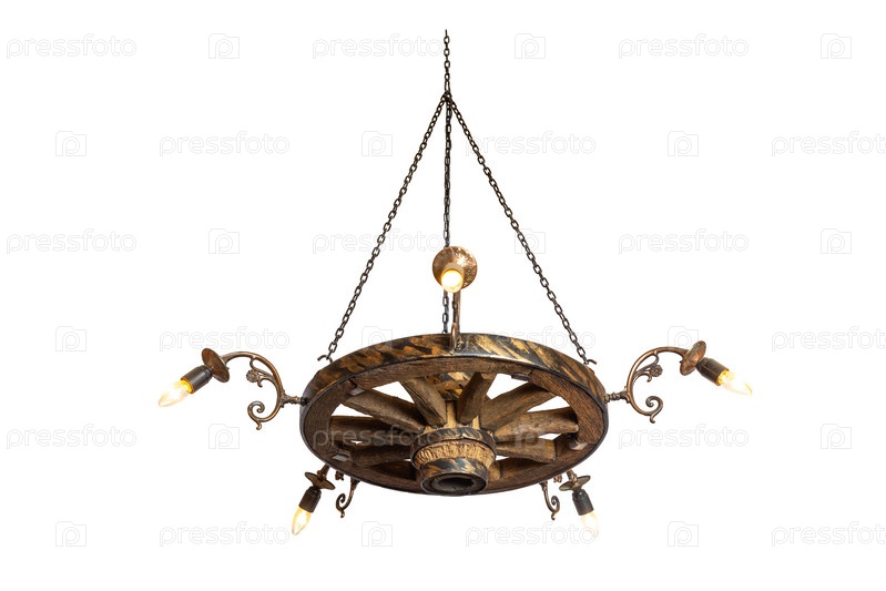 Декоративная люстра из тележки на цепях и со скрытой проводкой. Деревенская люстра из деревянного колеса телеги, изолированного на белом