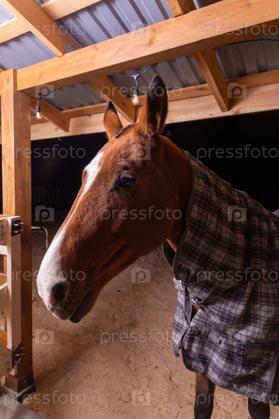 Портрет крупным планом чистокровной седельной лошади в клетчатом одеяле от холодной погоды, стоящей в приюте в загоне