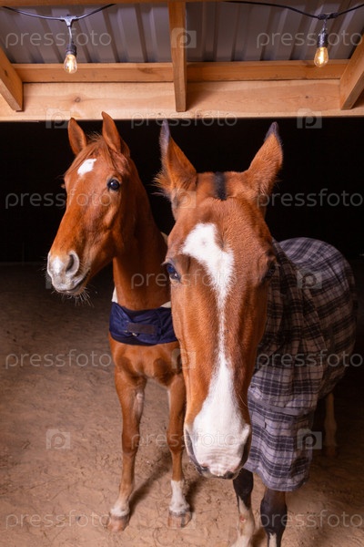 Портрет крупным планом двух чистокровных седельных лошадей в клетчатом одеяле от холодной погоды, стоящих в приюте в загоне