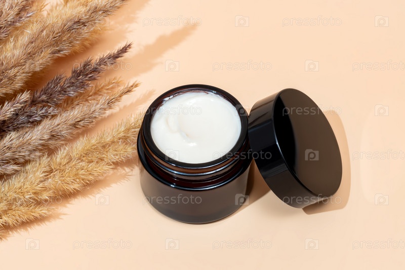 Крем для лица на бежевом фоне. Украшение из сухого камыша или пампасной травы. Профессиональный флакон для ухода за лицом и телом. Нефирменная упаковка, банка из темного стекла