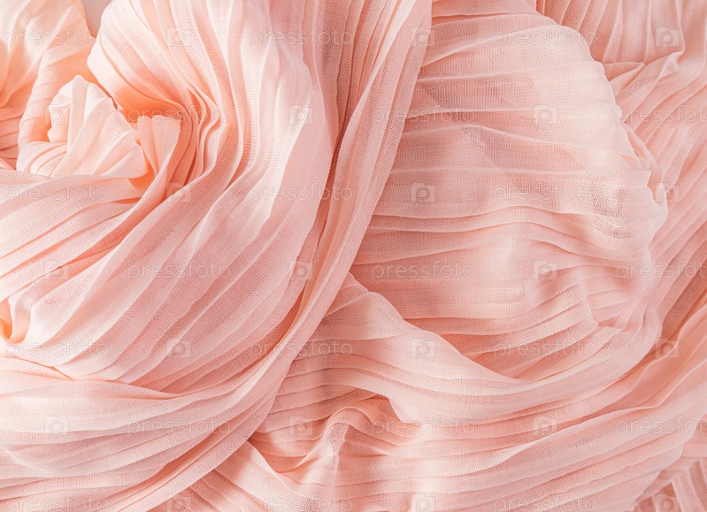 Нежные воздушные волны из шелковой или шифоновой ткани персикового цвета. Макет для дизайна. Фоновое изображение для праздничного декора. Цвет 2024 года «Персиковый пух»