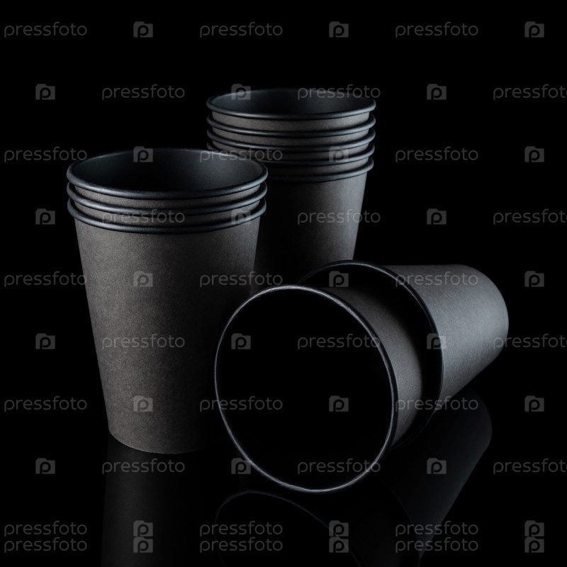 Черные, коричневые пустые бумажные стаканчики на черном фоне, несколько стоящих, несколько лежащих. Селективный фокус. Изолировать. Текстура, блики, отражение. Студийный снимок