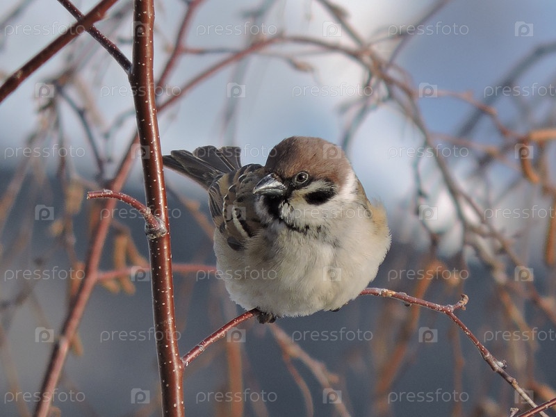 Сидящий на ветке воробей, всматривается в даль