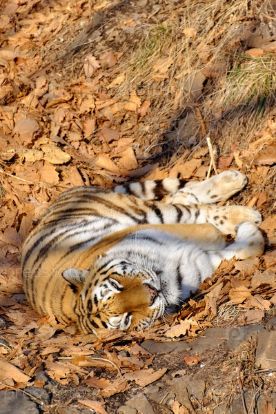 Амурский тигр греется на опавших листьях под теплым осенним солнцем