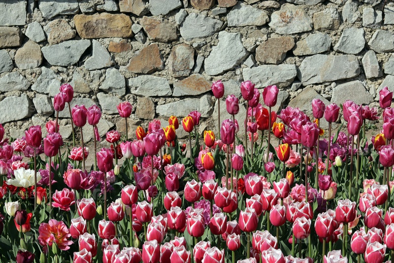 Яркие весенние тюльпаны на фоне каменной стены