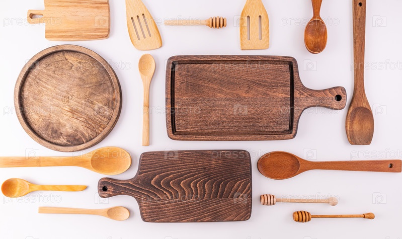 Набор различных деревянных ложек, лопаточек, разделочной доски из экологически чистых материалов на светлой столешнице. кухонный фон. Вид сверху. Плоская планировка