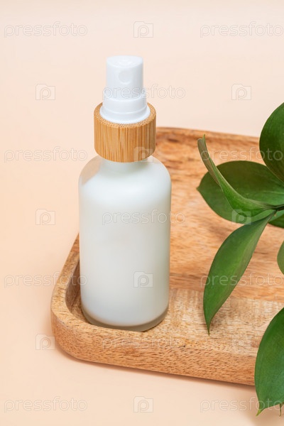 Косметическая бутылка на деревянном подносе на светло-бежевом фоне. Фон для брендинга, идентичности и упаковки косметической продукции