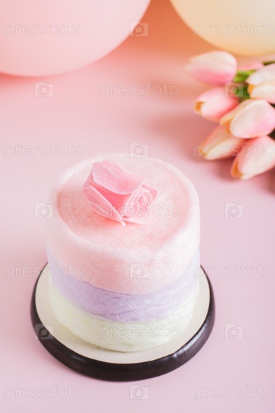 Торт из сладкой ваты, цветы, свечи и воздушные шары для вечеринки на столе, вертикальный вид