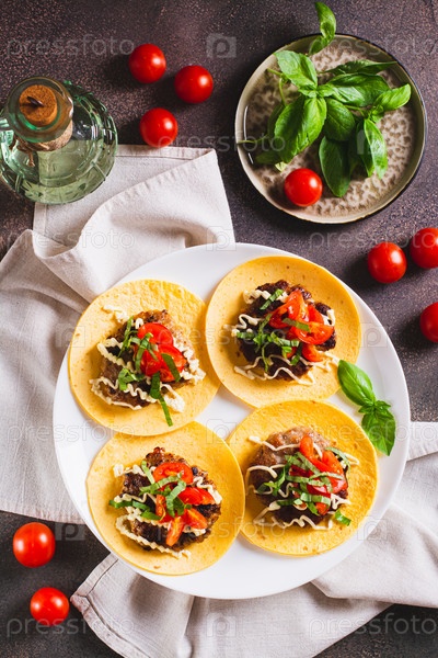Разбейте бургер-тако с соусом, помидорами и базиликом на тарелке на столе и вертикальном виде