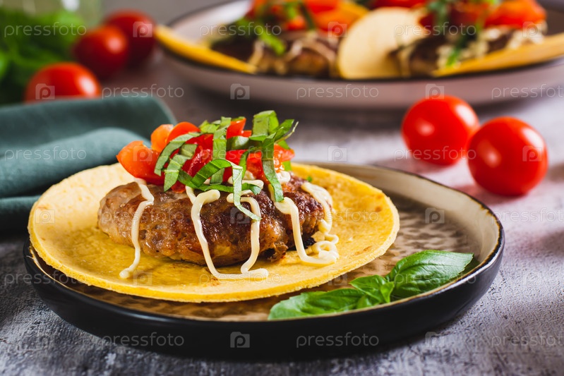 Разбить бургер-тако с говяжьей котлетой, помидорами и зеленью на тарелке