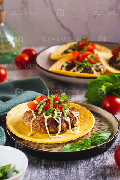 Разбейте бургер-тако с говяжьей котлетой, помидорами и зеленью на тарелке, вертикальный вид