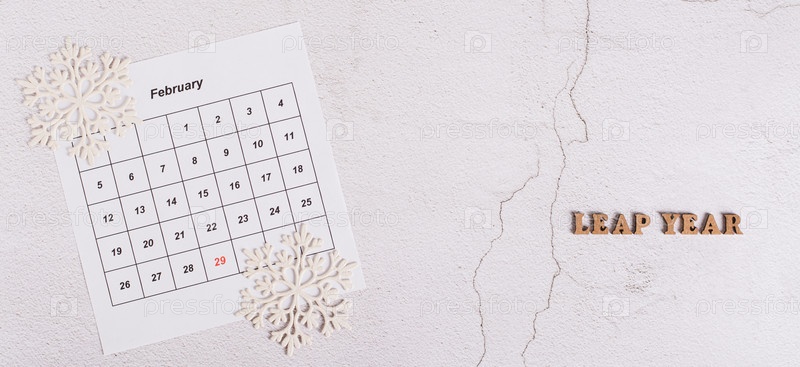 Концепция високосного года, календарь, снежинки и текст на светлом веб-баннере с видом сверху
