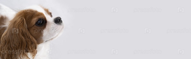 Крупным планом портрет милого щенка. Баннер. Лицо собаки на сером фоне. Кавалер-кинг-чарльз-спаниель Бленхейм