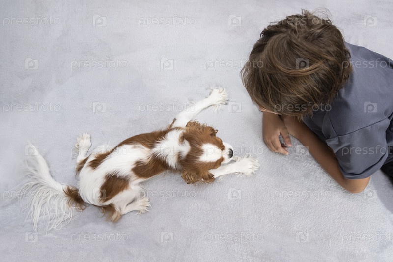 Мальчик, 10 лет, темные волосы, играет дома с собакой. милый щенок кавалер-кинг-чарльз-спаниеля. Очаровательный питомец