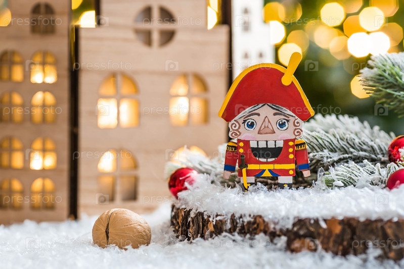 Игрушечный солдатик Щелкунчик и грецкие орехи на рождественском фоне с гирляндой. Балет Чайковского. Рождественская новогодняя открытка 2024