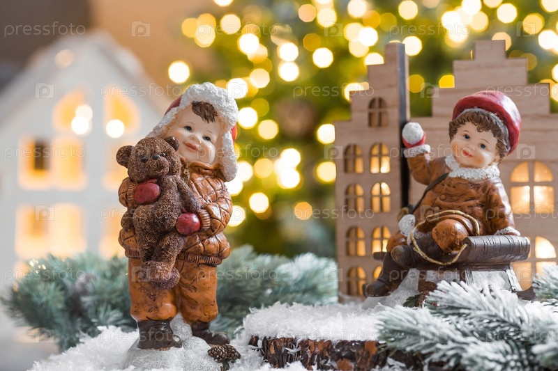 Рождественская открытка в стиле ретро с милой фигуркой ребенка на красивом заснеженном фоне. Мальчик в шапке-ушанке обнимает медвежонка. Концепция зимнего праздника Нового 2024 года