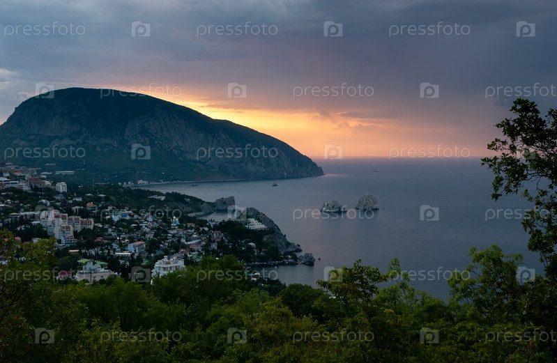 Морская бухта со скалами «Адалары». Городок на берегу. Лучи восходящего солнца выходят из-за горы Аю-Даг (Медвежья гора). Гурзуф, Ялта, Крым
