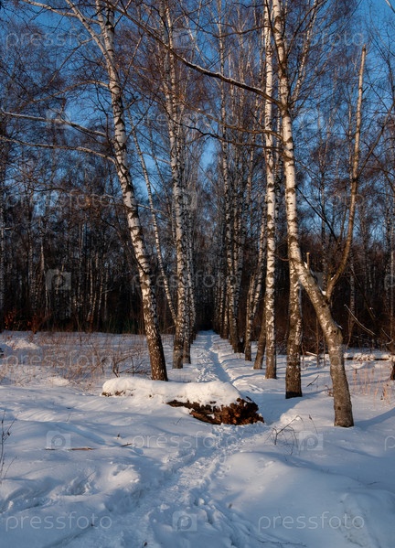 Заснеженная тропа между белыми березами. Глубокий снег, упавшее дерево. Московская область