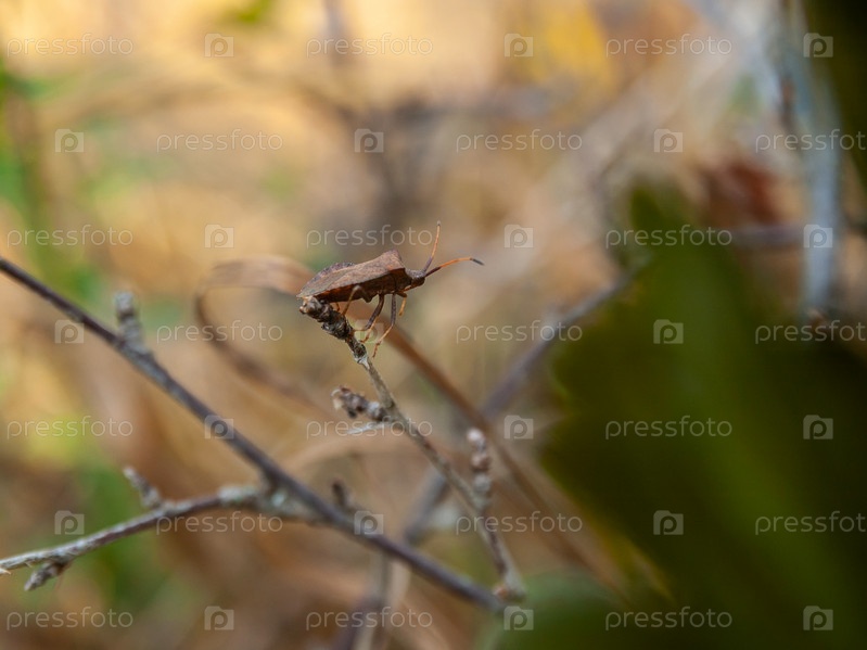 Садовый жук (Picromerus) на ветке смородины слушает в окружении пастельных тонов