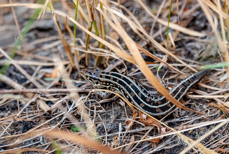 Ящерица пестрая, полосатая и пятнистая в желтой сухой траве