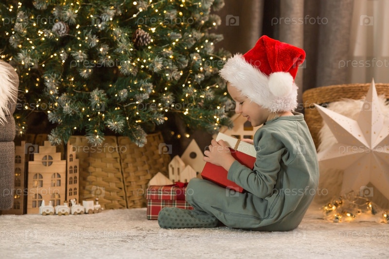 Красивый маленький мальчик заглядывает в волшебную шкатулку под елкой. Новогодний подарок. Концепция празднования Рождества и Нового 2024 года